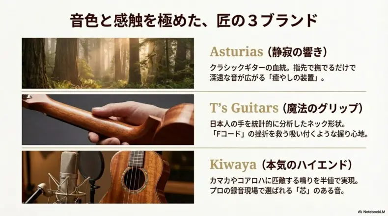 ここからは、具体的にチェックしておくべき日本の代表的なウクレレブランドを、私の独断と偏見を交えつつ、圧倒的な文字数で詳細に解説します。それぞれのブランドが持つ「匂い」や「手触り」まで想像しながら読んでください。