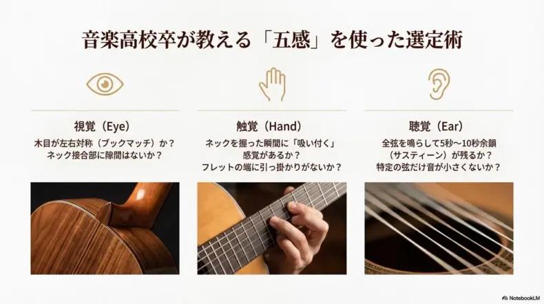 さて、ここまで素晴らしいブランドを紹介してきましたが、最終的にあなたにぴったりの一本を選ぶための「極意」をお伝えします。これは音楽高校で楽器の目利きを徹底的に叩き込まれた私なりの、失敗しないためのチェックリストです。スペック表を見るだけでは分からない、「五感で選ぶ技術」を身につけてください。