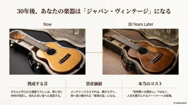 しかし、中古購入には注意も必要です。個人間取引(フリマアプリ等)では、「乾燥でトップ板が割れている」「ネックが捻れている」といった致命的な欠陥が隠されていることが非常に多いです。国産の良さを100%味わうためには、信頼できる楽器店(出典:キワヤ商会認定ディーラー等)で購入してください。良い国産ウクレレは、きちんとメンテナンスすれば、世代を超えて受け継がれる「家族の宝」になり得るのです。