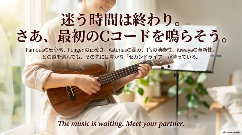 音楽は一生続けられる素晴らしい趣味です。そのスタートラインに、日本が誇る最高のウクレレがある。これほど心強いことはありません。Famousの安心感、Fujigenの正確さ、Asturiasの深み、T’sの演奏性、Kiwayaの革新性。どの道を選んでも、その先には豊かな毎日が待っています。あなたが指先を弦に触れ、最初のCコードを鳴らした瞬間、その振動はあなたの人生を少しだけ明るい方へと導いてくれるはずです。この記事が、あなたにとって最高の「相棒」との出会いを後押しするものになれば、これ以上の喜びはありません。