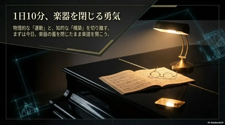 「ピアノの鍵盤を物理的に押し込む」というフィジカルな作業と、「音楽を脳内で構築し、想像する」という知的な作業を、まずはあなたの中で一度明確に切り離してみてください。