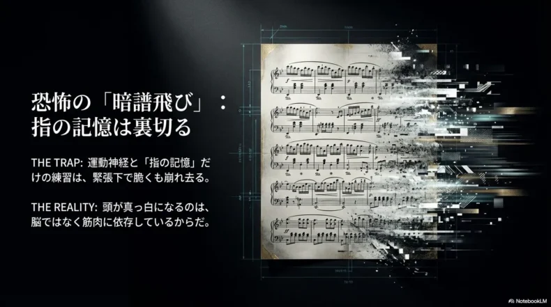 | 暗譜へのアプローチ | 楽譜を見ずに何百回も反復して弾き、指の筋肉に無意識に覚えさせる(マッスルメモリーの過信)。 | 楽譜の形式、和声の進行、フレーズの構造を論理的に分析し、脳の記憶として確固たる地図を定着させる。 |
