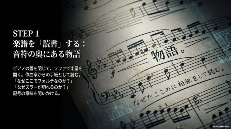彼らはピアノに向かって指を動かし始める前に、まず楽譜を徹底的に「熟読」し、楽曲の構造を巨大な建築物の設計図を読み解くように、極めて論理的に理解するアプローチをとります。