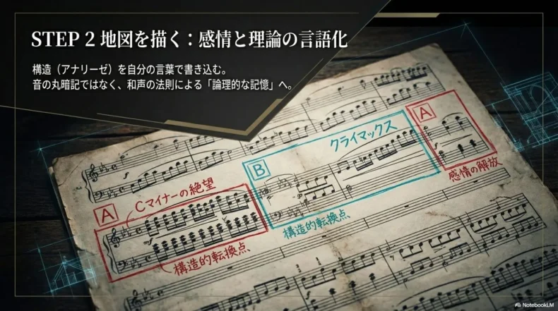 「ここはCメジャー(ハ長調)の明るい響きから、突然同主調のCマイナー(ハ短調)に転調して絶望的な響きになっている」「この左手の分散和音(アルペジオ)は、単なる伴奏ではなく、実は隠れた対旋律(もう一つのメロディライン)として機能している」など、曲の骨組みを理論的に分析します。