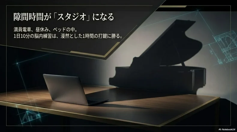大切なのは、実際の物理的な打鍵練習(ハードウェアの訓練)と、脳内でのエアピアノ練習(ソフトウェアの構築)の「あなたにとっての黄金比」を見つけ出し、両輪をバランス良く回していくことです。