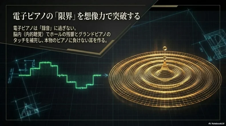 この「脳内で補完した理想の本物の響き」と「現実に出ている電子音」を常に比較し、想像力で補いながら練習することで、電子ピアノ特有の「雑なタッチでも綺麗な音が出てしまう」という罠にはまり、表現力やタッチの繊細さが低下してしまうのを防ぐことができます。