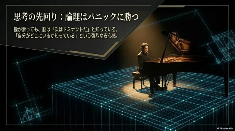 もし緊張で指が震え、間違った鍵盤を叩いてしまい「あっ!」と頭が真っ白になりかけたとしても、「大丈夫だ。次はCメジャー(ハ長調)の主和音がドーンと来る展開だ」「ここは左手がメロディを支える重要なベースラインで、右手の細かいパッセージは単なる飾りに過ぎないから、最悪右手が転んでも左手さえ守り抜けば曲は崩れない」といった、明確な楽曲構造の知識と思考の道標が脳の深層に刻み込まれていれば、大事故になることは絶対にありません。