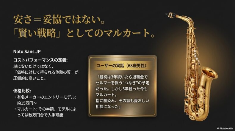 しかし、マルカートならその半額近い価格、モデルによっては数万円台で手に入ります。実際に私のサックス仲間の友人(68歳男性)は、「最初はマルカートで様子を見て、3年続いたら退職金でセルマーを買う」という計画で始めました。ところが、5年経った今でも彼はマルカートを吹き続けています。「いやあ、最初は繋ぎのつもりだったんだけどね。吹いているうちに、こいつの癖も、良いところも分かってきて。今じゃ指に馴染んじゃって、もうこれでいい、いや、これがいいんだよ」と、愛おしそうに楽器を磨きながら笑っていました。