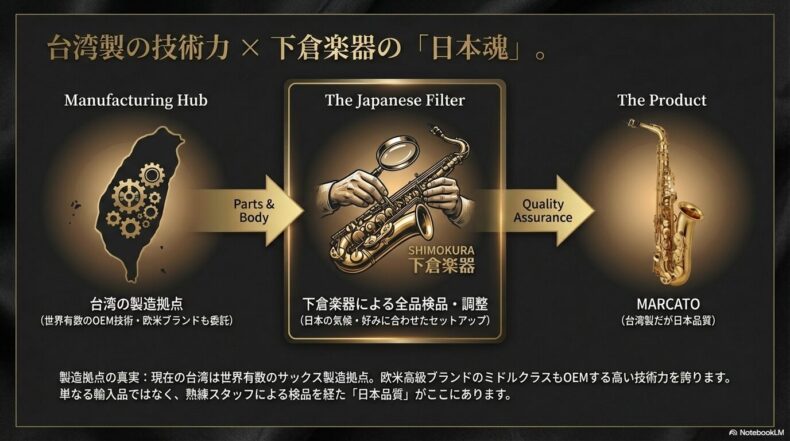 現在の台湾は、世界有数のサックス製造拠点となっており、その技術力は極めて高いレベルにあります。実は、名前を聞けば誰もが知るような欧米の有名高級ブランドのミドルクラスモデルも、製造自体は台湾の工場で行われている(OEM)ことが珍しくないのです。つまり、マルカートは「ノーブランドの安物」ではなく、「実績ある工場の技術で作られた、コストパフォーマンスの高い楽器」なのです。