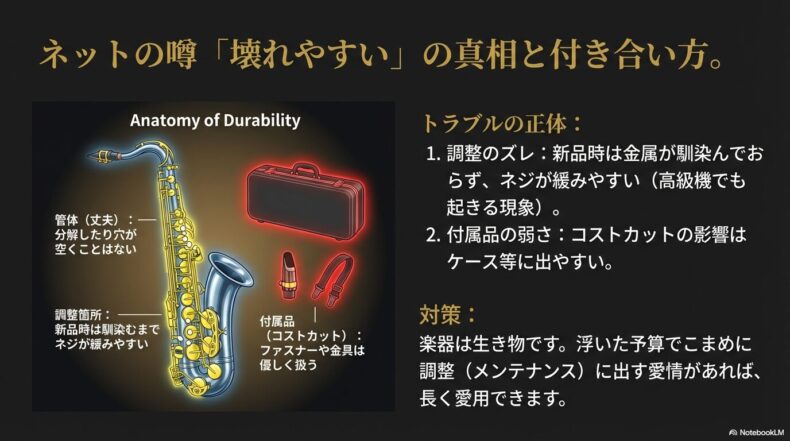 確かに、数十年使い続けることを前提とした何十万円もする楽器に比べれば、金属の硬度やメッキの厚み、バネの材質などでコストダウンが図られているのは事実でしょう。しかし、これは「寿命が極端に短い」というよりは、「メンテナンスの頻度が少し多くなるかもしれない」程度に捉えるのが正解です。