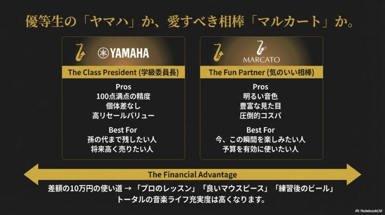 「孫の代まで残す家宝にしたい」「将来的に高値で売りたい」なら、迷わずヤマハやセルマーをおすすめします。でも、「今、この瞬間、私が楽しむための道具として使い倒したい」と割り切るなら、その価格差分の価値はマルカートに軍配が上がります。10万円の差額は大きいです。ブランドロゴの刻印よりも、出てくる音と自分の財布とじっくり相談して決めるのが一番です。