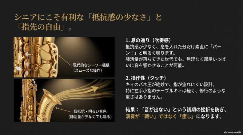音色は驚くほど明るく、素直です。まるで、天気の良い日の青空のような、曇りのないサウンド。これは、年齢とともに肺活量や口輪筋の力が落ちてきた私たちシニアにとって、非常に大きなアドバンテージです。重厚な抵抗感のある楽器を必死にねじ伏せるような吹き方ではなく、リラックスして息を流すだけで、朗々とした音色が部屋いっぱいに響いてくれる。演奏すること自体が「戦い」ではなく「癒し」になるのです。