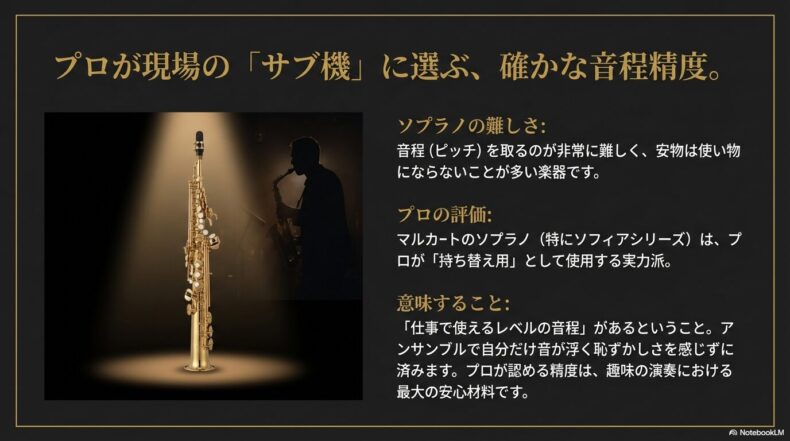しかし、マルカートのソプラノ(特に上位機種のソフィアシリーズ)は、プロのミュージシャンが「持ち替え用(サブ機)」として購入するほど評価が高いのです。これには明確な理由があります。