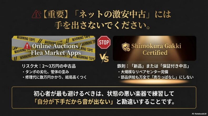 最初の安心を買うという意味でも、やはり新品を選ぶのがベストです。もしどうしても中古が良い場合は、個人売買ではなく、下倉楽器の中古コーナーでしっかりと整備された「保証付きの中古品」を選ぶのが賢明です。安物買いで後悔するより、少し背伸びをしてでも確かな相棒を手に入れる方が、結果的に音楽生活は長続きします。