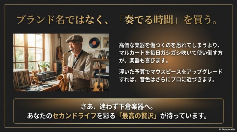 安さは「妥協」ではなく「賢い戦略」です。浮いた10万円で、プロの先生のレッスンに通ったり、少し良いマウスピースを買ったり、練習後の美味しいビール代に回したり。トータルでの「音楽ライフの充実度」は、むしろ高くなることも多いのです。