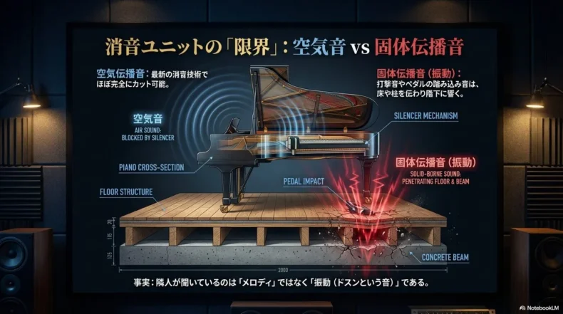 例えば、電子ピアノやサイレントピアノでヘッドホンをして練習している時を想像してください。あなたにはピアノの美しい音色が聞こえていますが、下の階の住人には何が聞こえているでしょうか?答えは、ハンマーが弦を叩く「ゴトッ」という鈍い音と、ペダルを踏み込むたびに響く「ドスン」という重低音です。