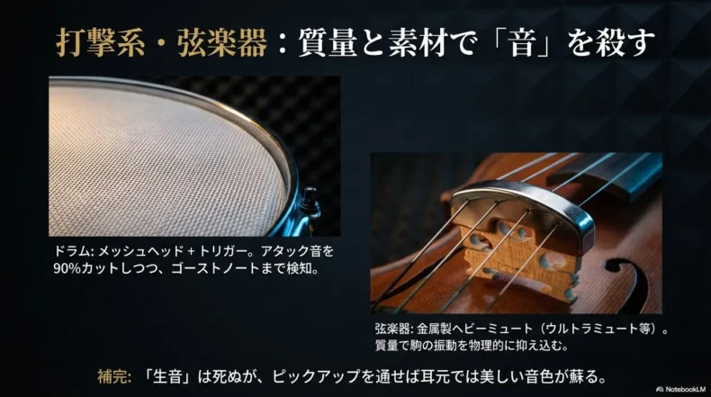 これらは「固体伝播音(こたいでんぱおん)」と呼ばれ、コンクリートや柱を介して驚くほど遠くまで伝わります。ドラムのキックペダル、電子ドラムのパッドを叩く音、バイオリンの足踏みなどがこれに該当します。残念ながら、どれだけ高価な消音ユニットを使っても、この「物理的な衝撃」そのものを空中で消すことは不可能なのです。