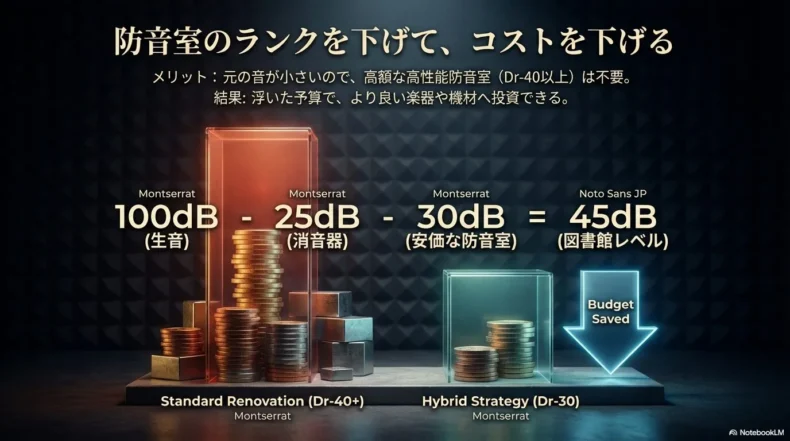 「防音室なんて高くて買えない」と諦めている方にこそ、この「併用プラン」を知っていただきたいです。実は、消音ユニットを使うことを前提にすれば、防音室のランクを数段階下げても問題ないのです。