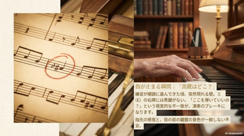 特に60歳を過ぎてからピアノを再開した私のような世代にとって、こうした音楽の「ちょっとした不思議」は、一度気になると頭から離れなくなってしまうものです。指先の感覚は少しずつ養われてきても、楽譜と鍵盤の視覚的な不一致は、演奏のスムーズさを妨げる大きな壁になりがちですよね。