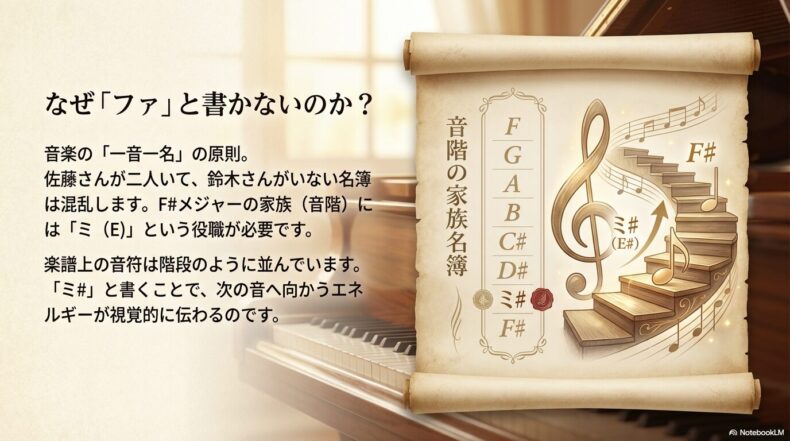 その理由は、音楽の美学である「一音一名の原則」にあります。例えば、嬰ヘ長調(F# Major)の音階を思い出してみてください。F#, G#, A#, B, C#, D#, E#, F# という並びです。私の人生経験に照らし合わせると、これは家族の名簿を作るようなものです。佐藤さん(F)が二人いて、鈴木さん(E)がいない名簿は、後から見た時に混乱しますよね。「ミ」という名前を維持しつつ、半音高い役割を演じてもらう。だからこそ「ピアノ ミ の シャープ」という名前が必要なのです。