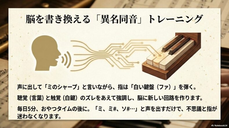 知識を指の筋肉に覚え込ませるには、ちょっとしたコツが必要です。私は毎日のおやつの時間、大好きなモンブランを食べた後に、5分だけ「異名同音トレーニング」をしています。やり方は簡単。ピアノの前に座り、「ミ、ミ#(ファ)、ソ#、ファ#、ミ#(ファ)、ミ」と、声を出しながら弾くのです。自分の声で「ミのシャープ」と言いながら、指は「白い鍵盤」を叩く。この聴覚と触覚のズレをあえて強調することで、脳が新しい回路を作ってくれます。