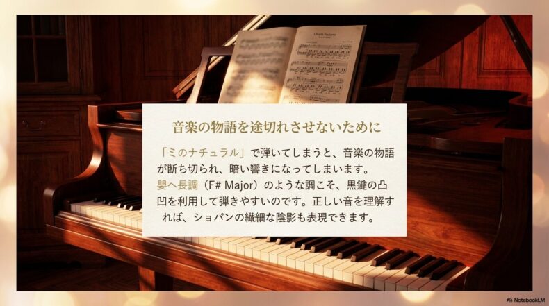 【状況】ショパンの遺作など、嬰ヘ長調の美しいバラードを弾く際、この「白鍵のシャープ」を理解していると、曲の持つ繊細な陰影を指先で表現できるようになります。