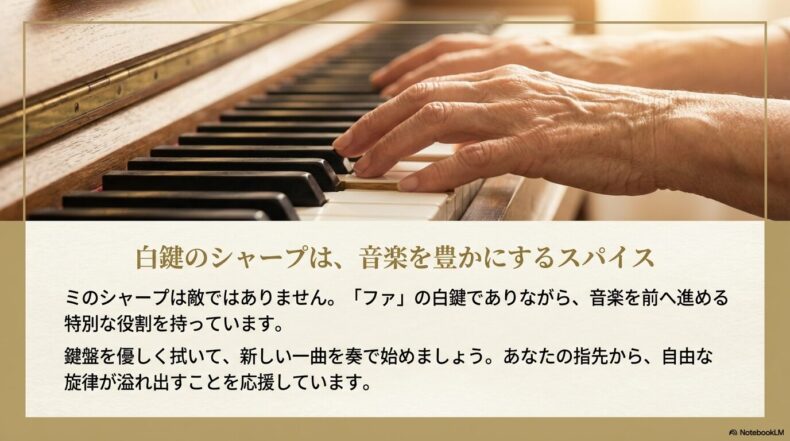 ここまで読んでくださったあなたは、もう「ミのシャープ」という名前に怯えることはありません。それは単なる「ファの白鍵」でありながら、音楽という素晴らしい物語を紡ぐために必要な「ミの進化形」なのです。今、あなたの指先はどんな感触を求めていますか?私はこの記事を書き終えたら、またピアノの前に戻り、ショパンの嬰ヘ長調の小品を弾いてみようと思います。