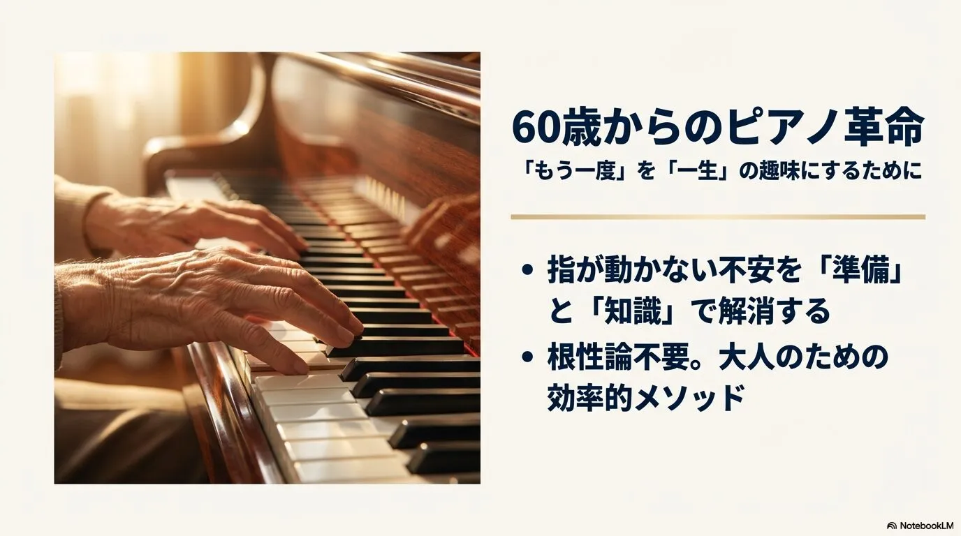 でも、断言させてください。60歳からのピアノ再開において、若い頃のようなスパルタ練習は一切不要です。むしろ、今の私たち世代の身体や脳の特性に合った「効率的なアプローチ」と「楽しむための工夫」さえ知っていれば、憧れの曲を挫折せずに完奏することは十分に可能です。