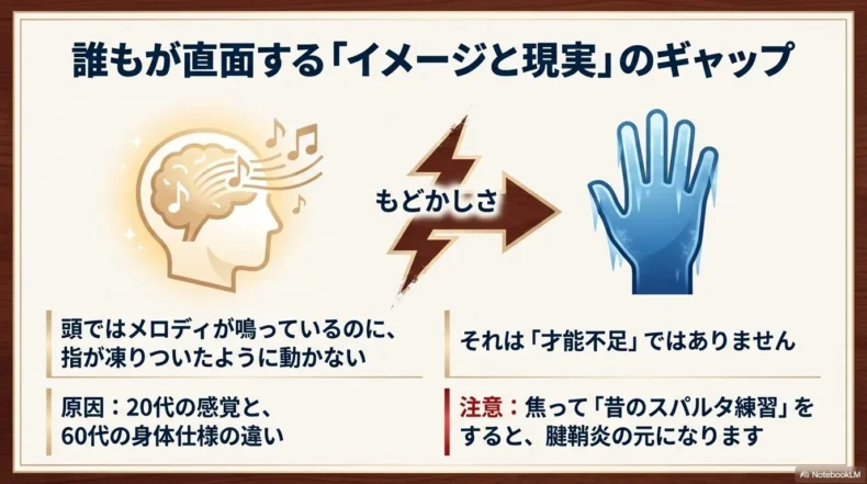 いざ「今日からピアノを再開しよう!」と意気込んでみたものの、数十年という長いブランクは想像以上に大きな壁となって立ちはだかります。気持ちは20代の頃のままなのに、身体がついてこない。このギャップに心を折られてしまうのが、再開組の最初のハードルです。