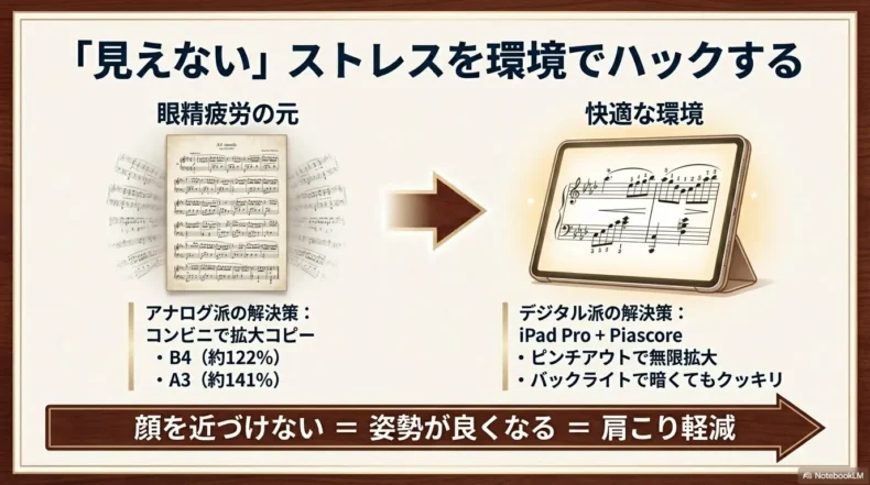 • 老眼対策には「楽譜の拡大コピー」と「タブレット」が必須。環境を整えればストレスは消えます。