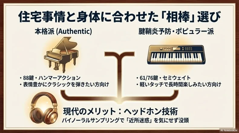 しかし、安心してください。現在はテクノロジーの進化により、軽量かつ高品質な「電子ピアノ」や「キーボード」という素晴らしい選択肢があります。これらは単なる代用品ではなく、シニア世代のライフスタイルに最適化された新しい楽器と捉えるべきです。
