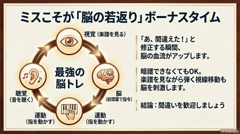 暗譜ができなくても、楽譜を見ながら弾ければそれで十分です。「昨日できなかったことが、今日少しだけできた」という小さな達成感の積み重ねが、ドーパミンを放出し、意欲を向上させます。記憶力テストのためにピアノを弾くのではありません。今の時間を楽しむために弾くのです。