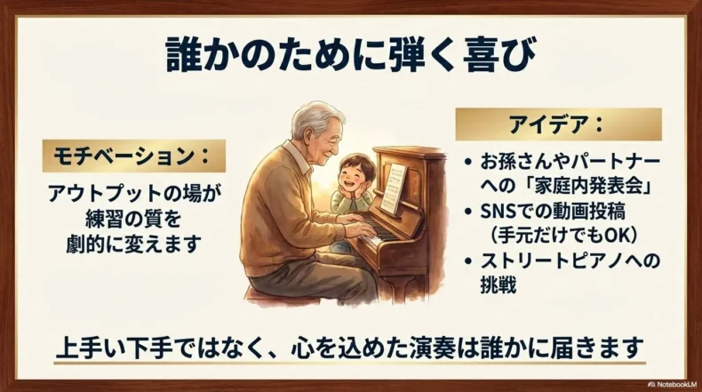 • 家庭内発表会: お孫さんが遊びに来た時や、パートナーの誕生日に、「一曲弾くから聴いてね」と宣言する。これだけで立派な本番です。