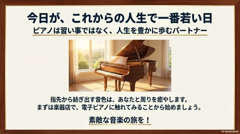 ピアノ再開は、単なる懐古趣味ではありません。それは、これからの人生を健康に、前向きに、そして豊かに過ごすための「未来への投資」です。指先から紡ぎ出される音色は、あなたの心だけでなく、周りの人の心も癒やす力を持っています。