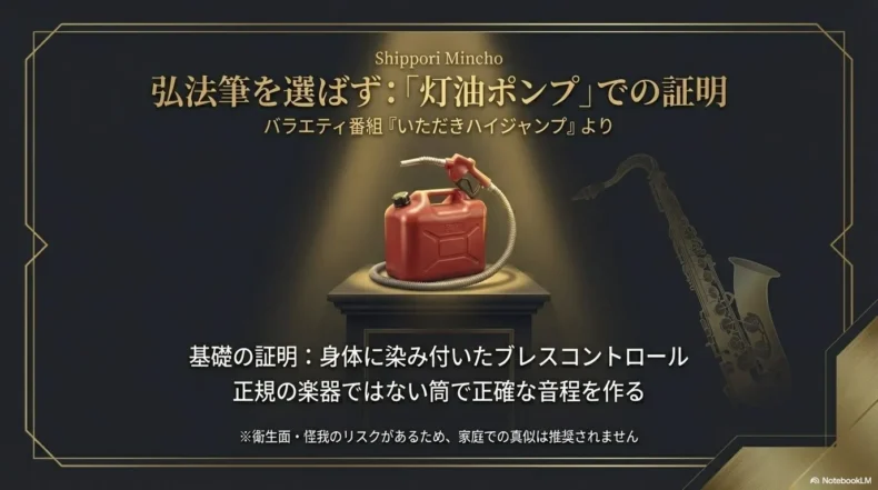 彼は番組の企画で、「灯油ポンプ」などの身近な日用品をつなぎ合わせた手作りのガラクタ楽器を使い、見事にサックスの音階を出して演奏するという離れ業に挑戦しました。