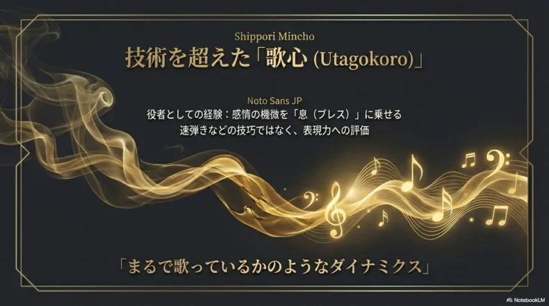 音楽用語で頻繁に使われる「歌心(うたごころ)」とは、楽譜通りに正確なピッチで音を出すだけでなく、まるで人が感情を込めて歌っているかのように、音の強弱(ダイナミクス)や揺らぎ(ビブラート)をコントロールする卓越したセンスのことです。
