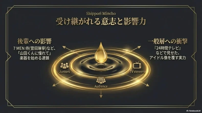 彼が奏でる色気のあるサックスの音色と、多忙を極める中でも音楽に対して決して妥協せず真摯に向き合うその背中は、事務所の後輩タレントたちにも非常に大きな影響を与えています。