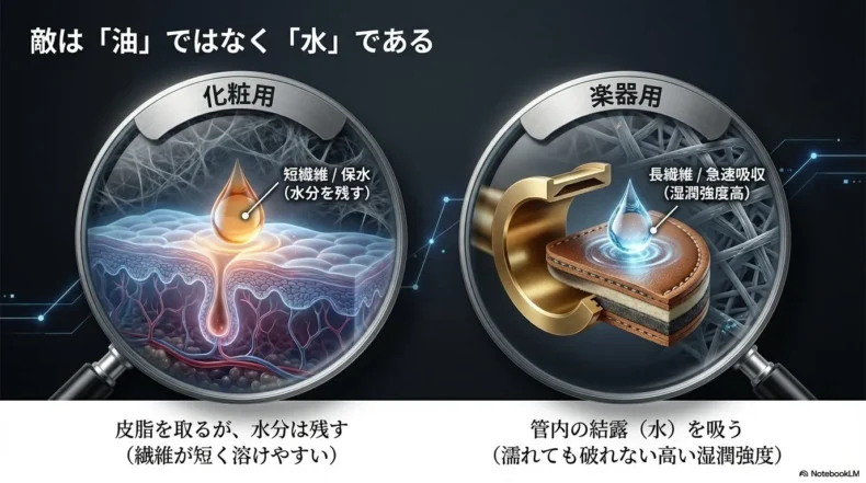 インターネットで検索すると、「100均のあぶらとり紙でも代用可能!」という記事やSNSの投稿を見かけることがあります。確かに、物理的に「紙を挟んで水を吸う」という行為自体は可能です。しかし、そこには「短期的な吸水」しか見ていない落とし穴があります。楽器のメンテナンスにおいて重要なのは、「その瞬間、水が取れるか」だけでなく、「それを繰り返した結果、楽器にダメージが蓄積しないか」という長期的視点です。