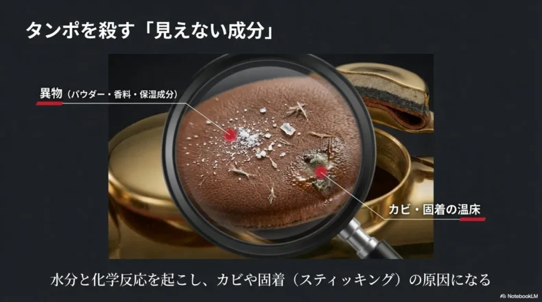 タンポの表面は「スキン」と呼ばれる非常に薄い動物の膜で覆われています。ここに化粧品の成分が付着すると、水分と化学反応を起こして「固着(スティッキング)」の原因になったり、最悪の場合はカビの温床になったりします。「タンポを掃除しているつもりが、実はカビの餌を塗りつけていた」なんてことになったら、目も当てられません。