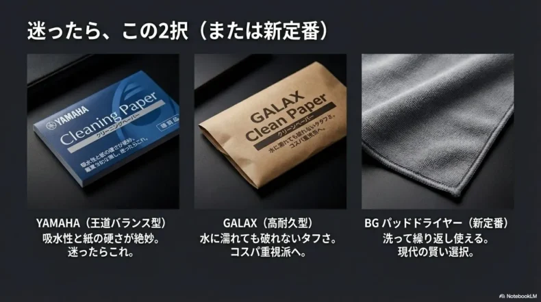 たった数百円のペーパー代をケチったり、横着をして「ズボッ」と引き抜いたりした代償が、数万円の修理代に化ける。私たちアマチュアバンドマンにとって、これほど痛い出費はありません。正しい動作は「挟んで、閉じて、開いて、取る」。このリズムを身体に染み込ませてください。ペーパーは「吸わせる」ものであって、「拭く」ものではないのです。