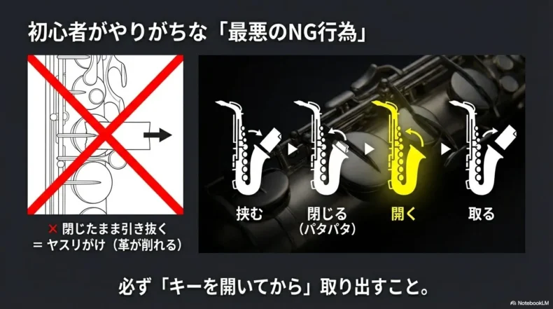 この記事の中で、もし一つだけ覚えて帰ってもらうとしたら、迷わずこれを伝えます。サックス初心者が無意識にやってしまいがちな、しかし最も破壊的なNG行為。それは「キーを閉じたままペーパーを引き抜くこと」です。