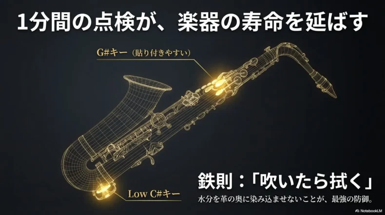 これらのキーは、常にタンポとトーンホールが密着しているため、湿気が逃げにくく、最もベタつきやすい(貼り付きやすい)箇所です。「いざソロでG#を吹こうとしたらキーが開かなくて音が出なかった」という失敗は、サックス奏者あるあるのトップ3に入ります。