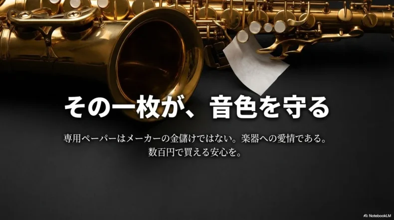 ここまで、サックスの「あぶらとり紙(クリーニングペーパー)」について、その種類から代用のリスク、そしてプロ仕様の使い方までを長々とお話ししてきました。たかが紙一枚、されど紙一枚。この小さなメンテナンス用品の選び方と使い方が、あなたのサックスライフを快適にするか、それともトラブル続きにするかの分かれ道だということが、お分かりいただけたかと思います。