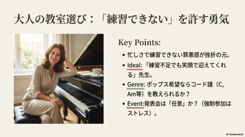 「今週は忙しかったですか?じゃあ今日は、ここでおさらいしながら一緒に指を動かしましょう!リフレッシュになりますよ」と言ってくれる先生なら、ピアノは「義務」ではなく「癒やしの時間」になります。「練習不足でも行っていいんだ」と思える場所を確保すること。これが大人の継続術です。