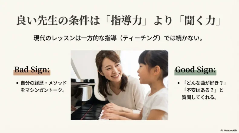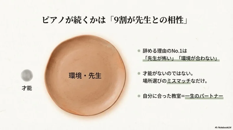 - ピアノが続くかは「9割が先生との相性」で決まる。