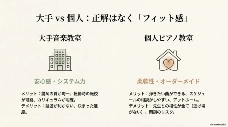 | 比較項目 | 大手音楽教室 | 個人ピアノ教室 |