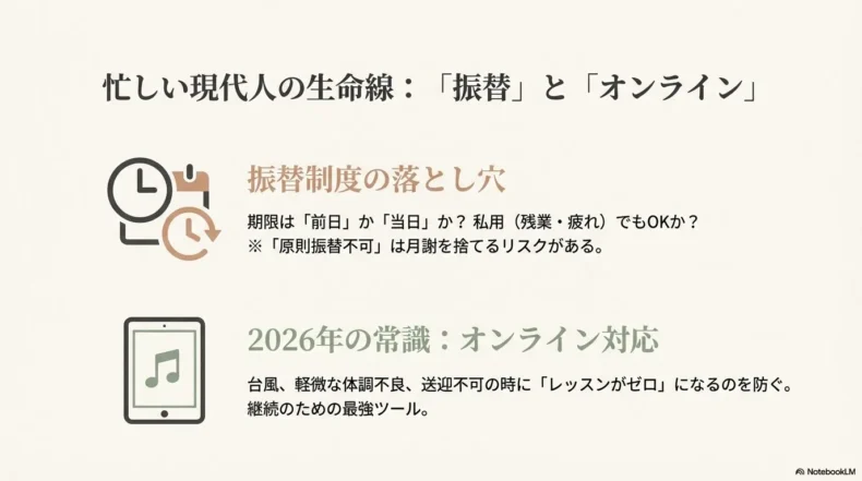 特に、残業の多い仕事を持つ大人や、塾・部活・他の習い事でスケジュールがパズルのようになっている現代の子供たちにとって、毎週決まった曜日の決まった時間に教室へ行くというのは、想像以上にハードルが高いミッションです。そこで、教室選びの生命線となるのが、「振替制度(補講)」と「オンライン対応」の柔軟性です。