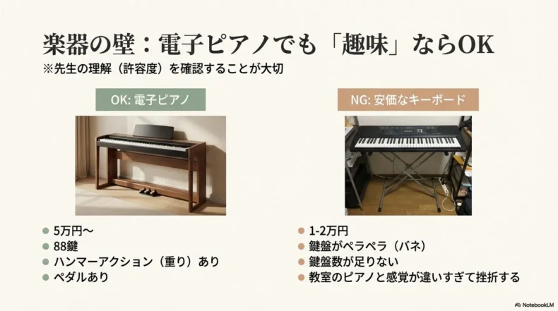 - 趣味なら電子ピアノでOK。ただし先生の理解が必要。