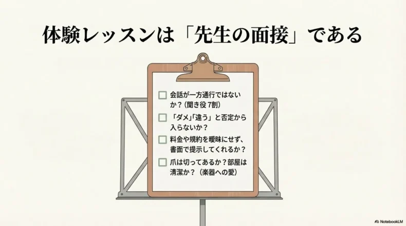 さて、いよいよ教室選びの最終関門、「体験レッスン」です。ここは、先生が生徒をチェックする場ではなく、「あなたが先生を面接する場」だと思って臨んでください。遠慮はいりません。