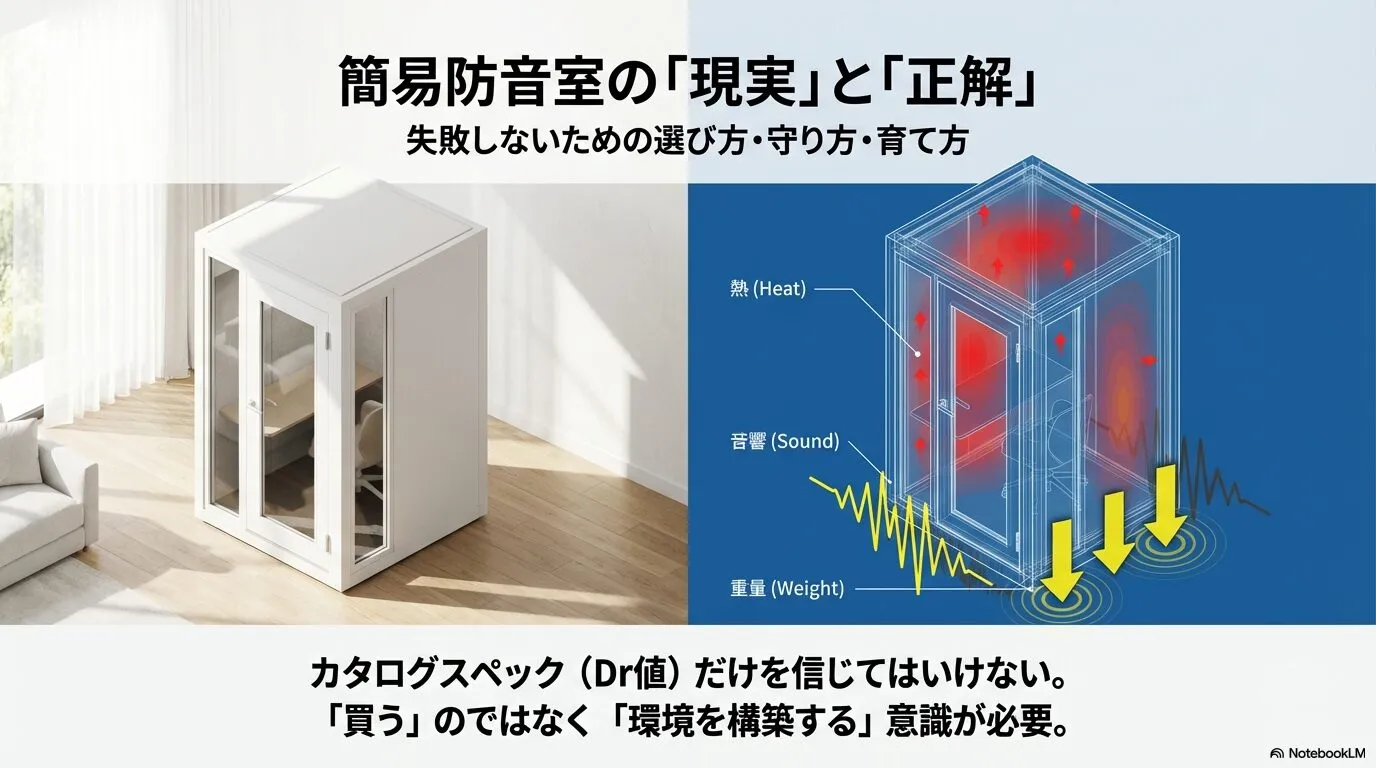 簡易防音室を選ぶ際、カタログに記載された「遮音性能(Dr等級)」の数値だけを信じて飛びつくのは非常に危険です。